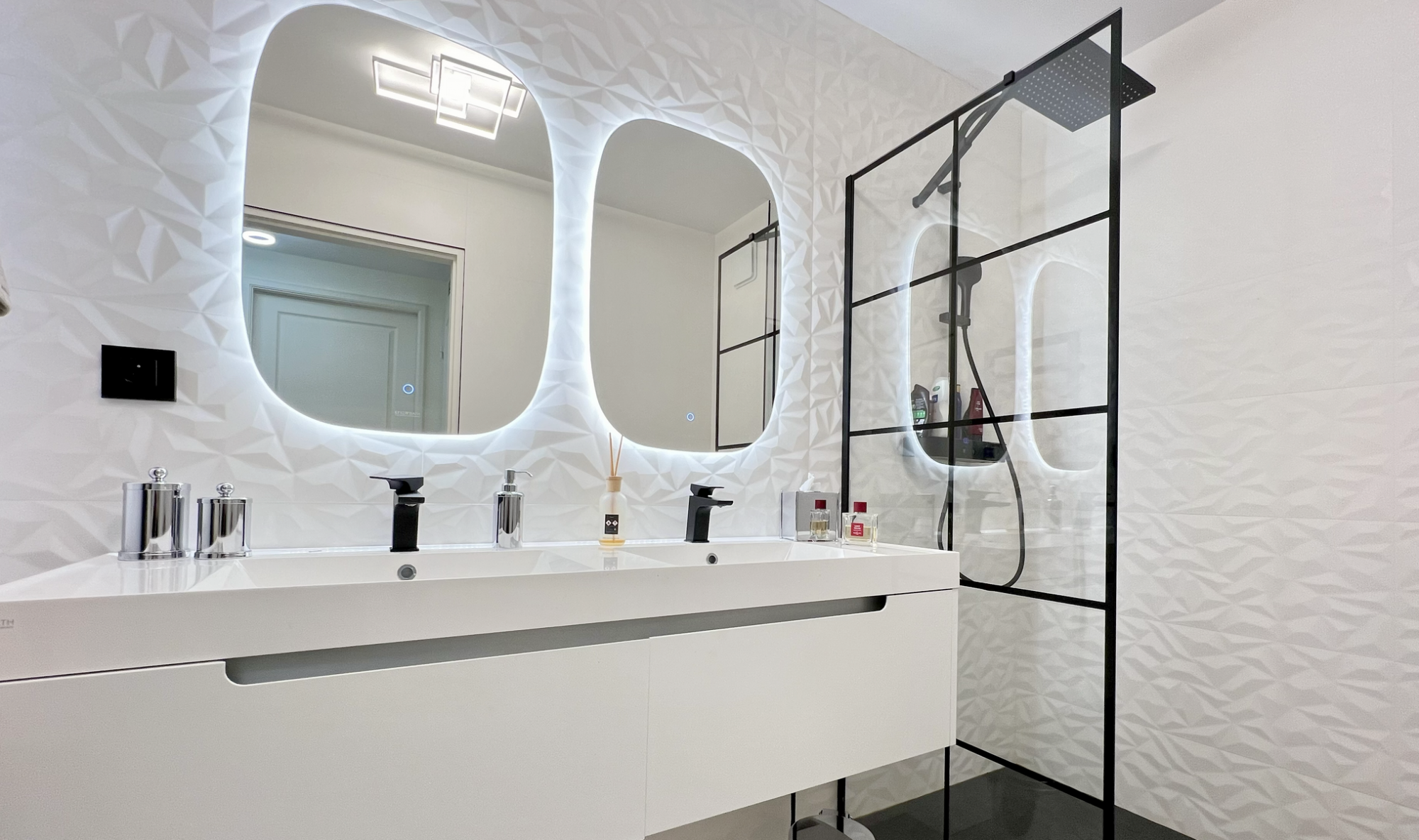 La surface privative de ce logement s'élève à 100 mètres carrés, une superficie qui se complète par un extérieur de 44 mètres carrés. L'appartement c'est avant tout un coup de cœur : la luminosité optimale dans les pièces, les prestations haut de gamme, les matériaux de qualité… chaque détail a été soigneusement réfléchi afin de créer une ambiance apaisante et confortable. Il se compose de trois chambres, de deux salles d'eau, de deux toilettes, d'une buanderie et d'un grand séjour avec sa cuisine équipée (45 m²). Le salon se prolonge sur une superbe terrasse en angle, sans aucun vis-à-vis avec une vue agréable sur le jardin de la résidence.